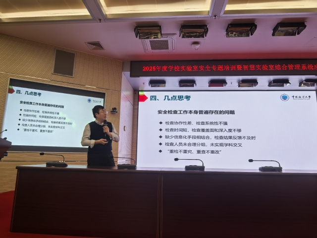 培训环节,国资处实验室安全科李恒副教授以《实验室安全检查与隐患整改》为题授课。他结合常见安全隐患案例,详解安全检查记录规范填写与问题整改闭环流程,对照教育部实验室安全检查303条要求,拆解学校实际案例中的实操要点,为参会人员提供系统指引。